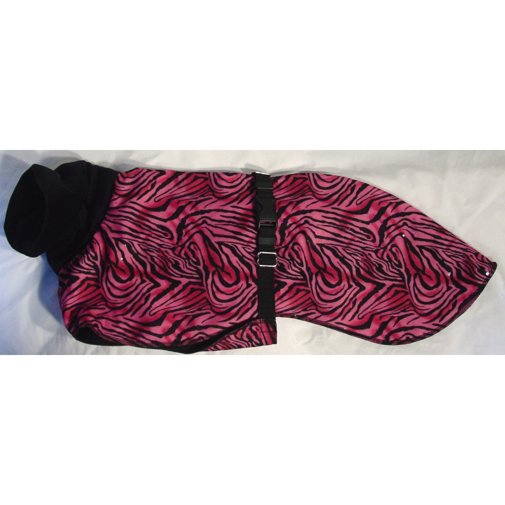 The coat is generous, covering the hindquarters for warmth. A breast piece comes through the front legs and protects the entire chest area – great if your dog is curled up in a crate waiting for you. The collar is soft Minky that drapes beautifully into ripples down the neck or folds back for a traditional collar. Two sizes are available – Medium and Large. The medium fits most whippets up to 32 pounds. The larger coat is for males, or a girl with a longer body. It fits whippets up to 45 pounds. A big bonus is that this fabric is easy to care for – wash in cool water and dry in a medium dryer. |