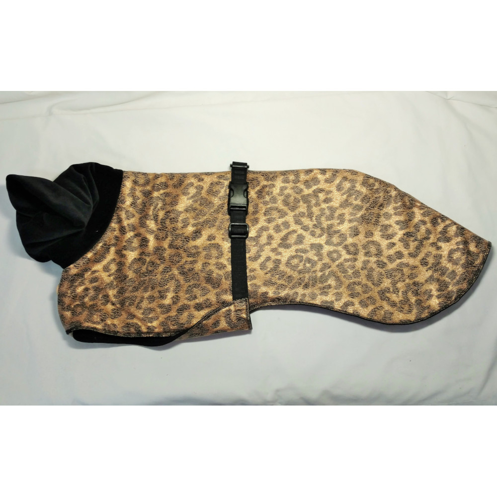 The coat is generous, covering the hindquarters for warmth. A breast piece comes through the front legs and protects the entire chest area – great if your dog is curled up in a crate waiting for you. The collar is soft Minky that drapes beautifully into ripples down the neck or folds back for a traditional collar.